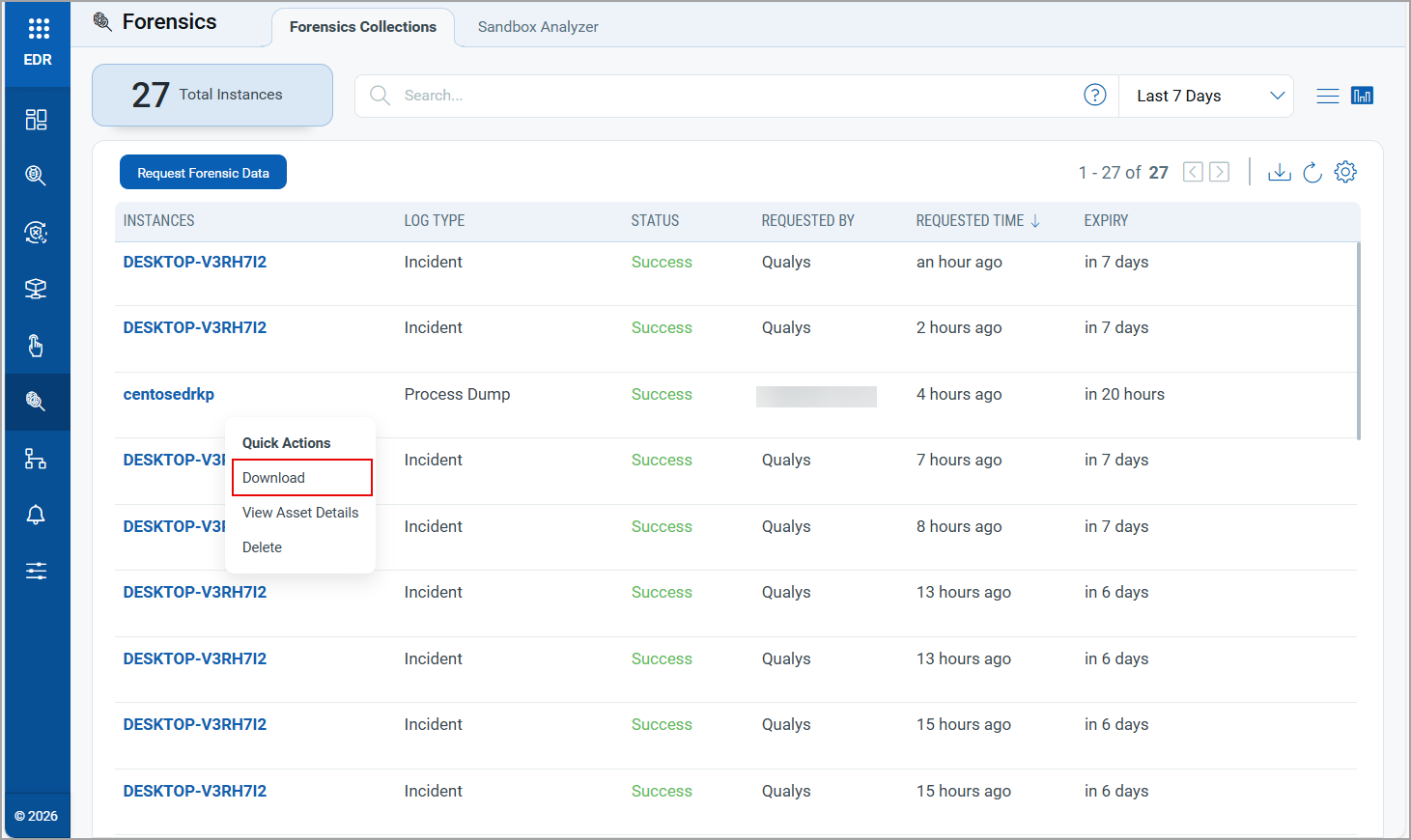 Once the request is complete, the Status column displays the result as Success. You can Download, View Asset Details, or Delete the instances from the Quick Actions menu of the Status column in the Forensics tab.