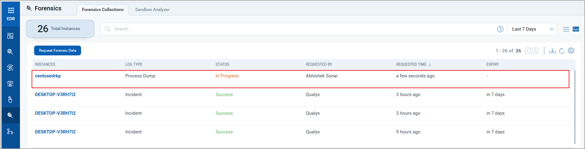 If a Forensic Request has been running (in progress status) for more than 15 minutes, the Status column displays the instance as Failed, Agent Response Timed Out. In such a scenario, you need to request the forensic data again. Meanwhile, if there is any response update for the earlier failed request, the status gets updated.