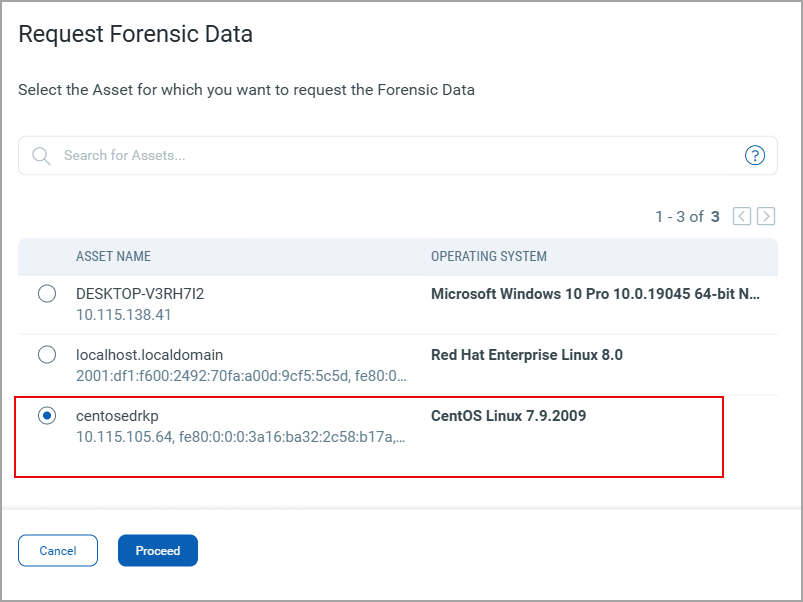 - In the Request Forensic Data window, select the required Linux asset for which you want the forensic data, and click Proceed.