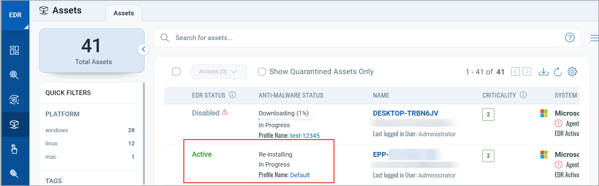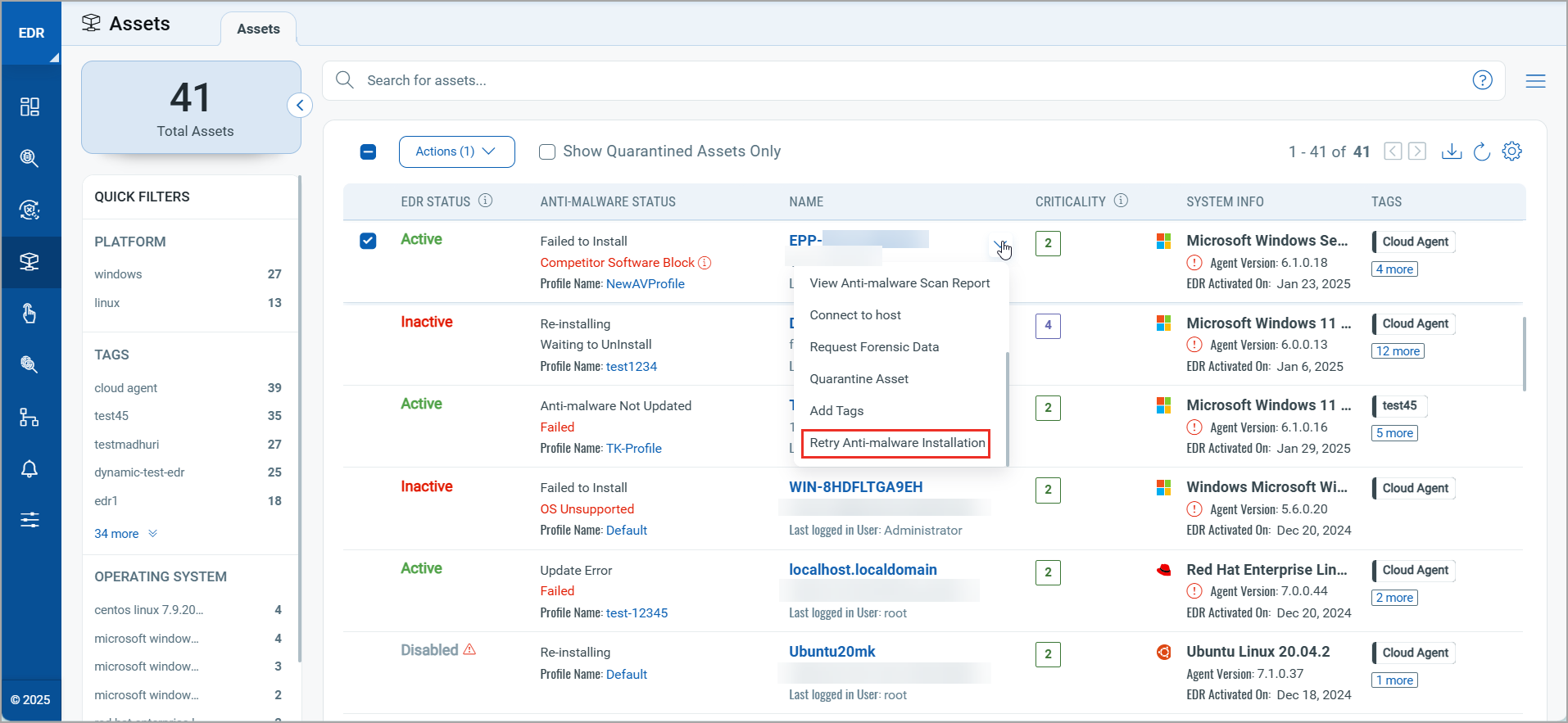 You can retry failed Antimalware Protection (EPP) installations. You can retry the anti-malware installation on individual assets or install it on multiple assets using the Actions drop-down menu.