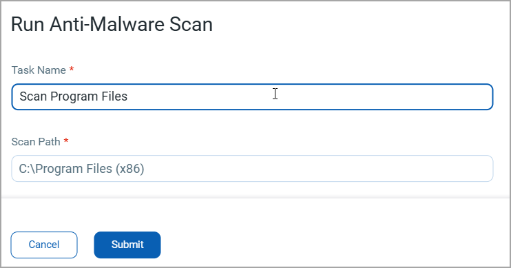 - In the Run Anti-Malware Scan window, provide the task name and scan path and then click Submit.