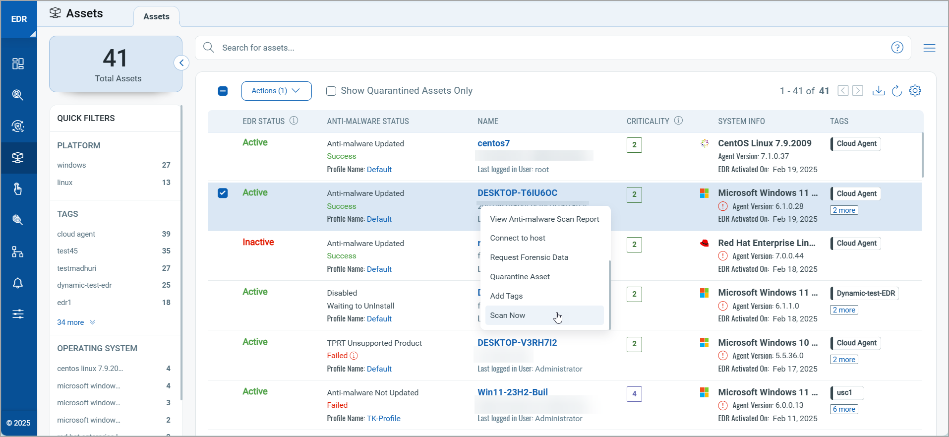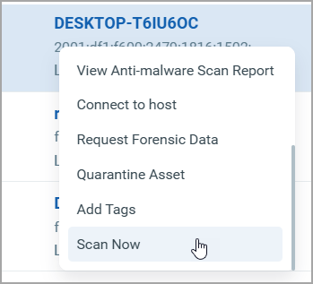 - In the Quick Actions menu, scroll to the bottom of the list and click Scan Now. You can also scan on multiple assets using the Actions drop-down menu.