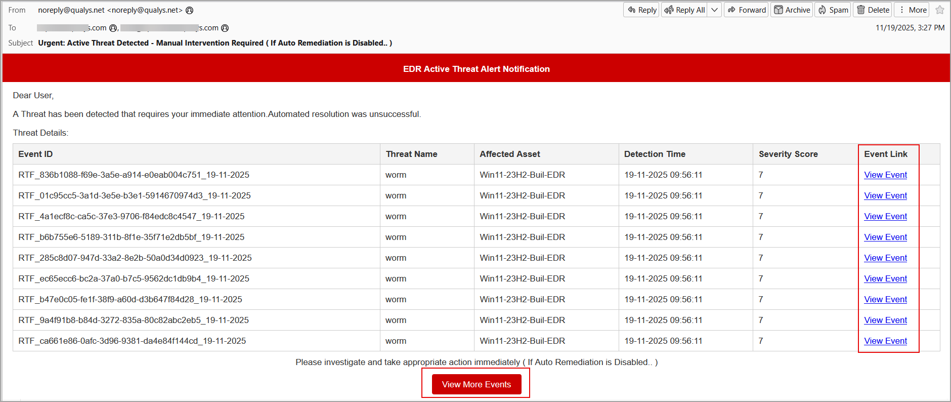 - Email details: The email includes a list of threat events, detection time, severity score, and the event link, View Event for each event.