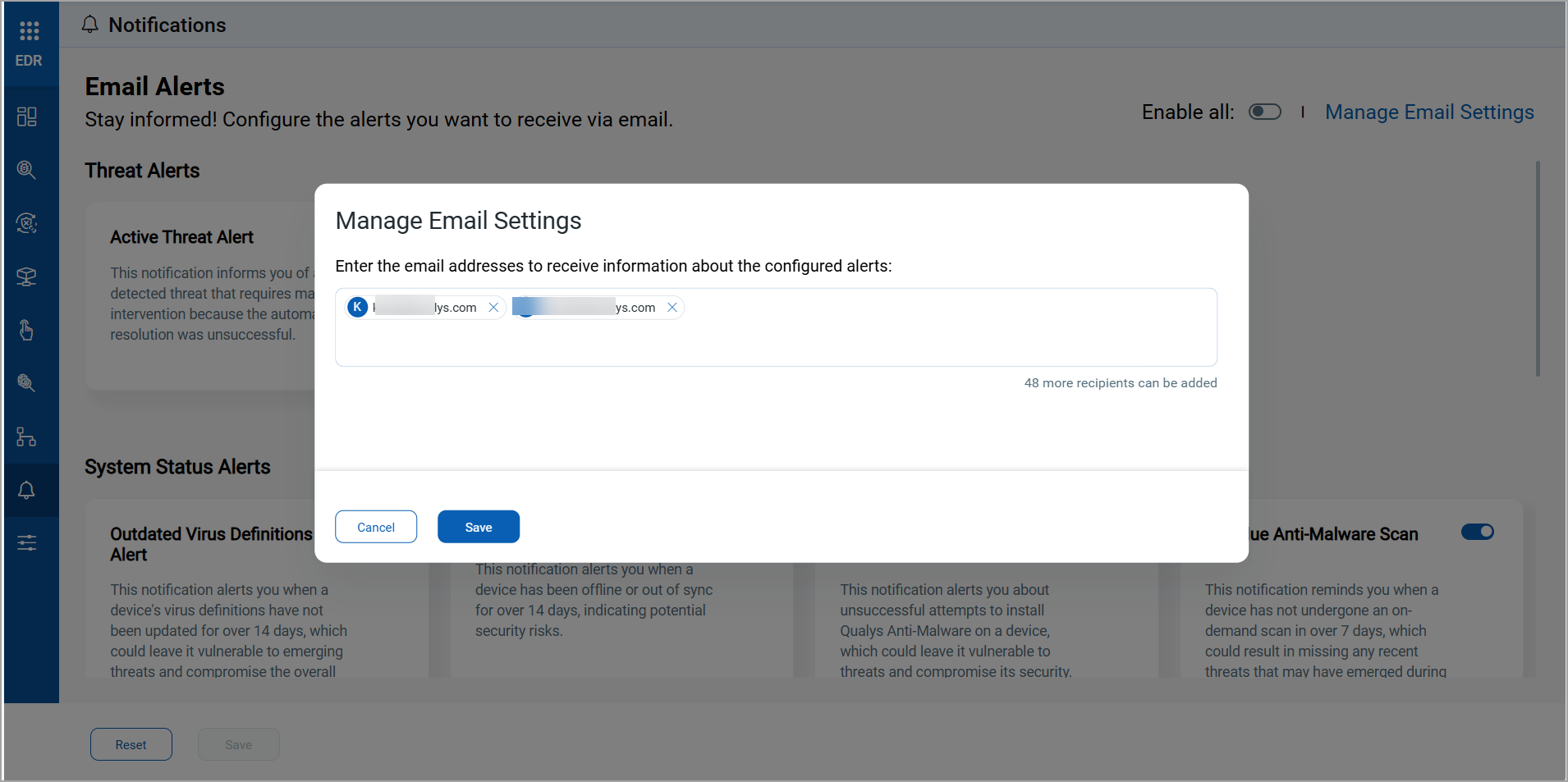 To receive the active threat email alerts, enable the Active Threat Alert from the Notifications tab, and add your email ID in the Manage Email Settings.