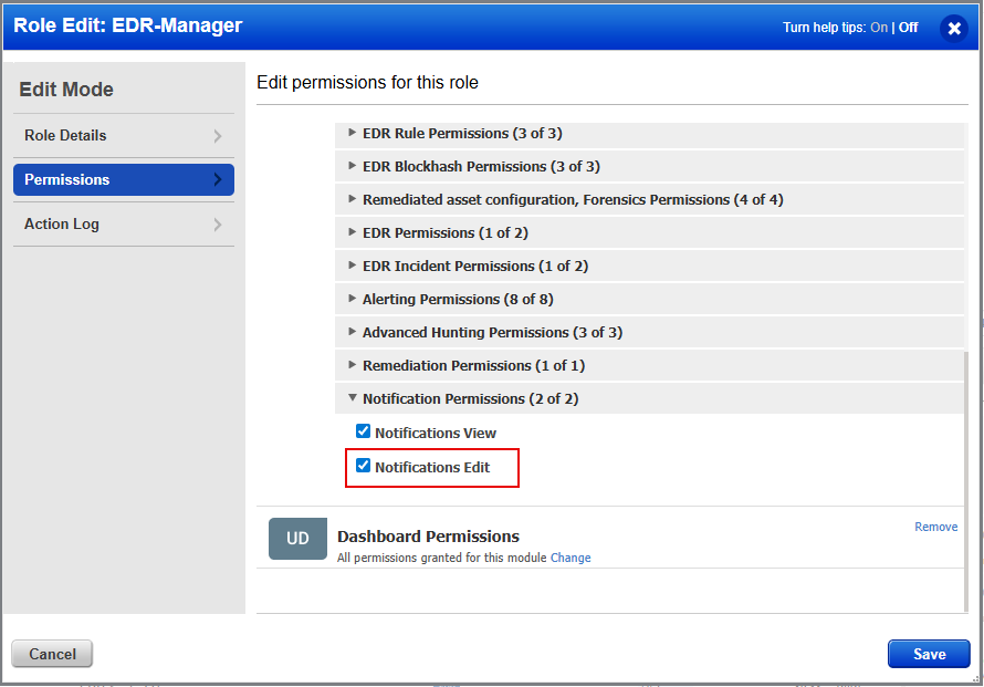 To access the permission, navigate to Admin > Role Management > select your EDR role > click Actions > Edit > Permissions.