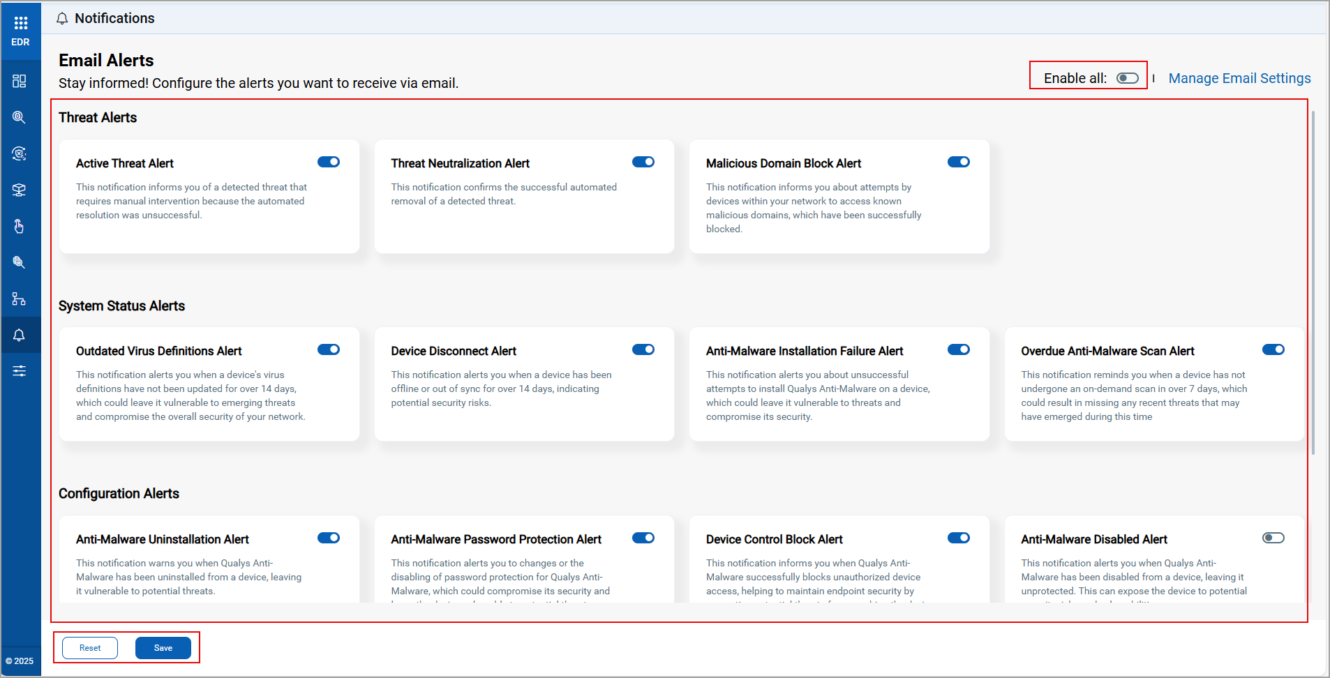With this permission, the sub-user can enable all the toggles and action buttons on the Email Alerts UI.