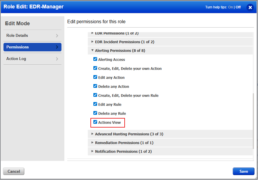 The Actions View permission is only applicable to the EDR module. In other modules, you can view the Actions tab by default.