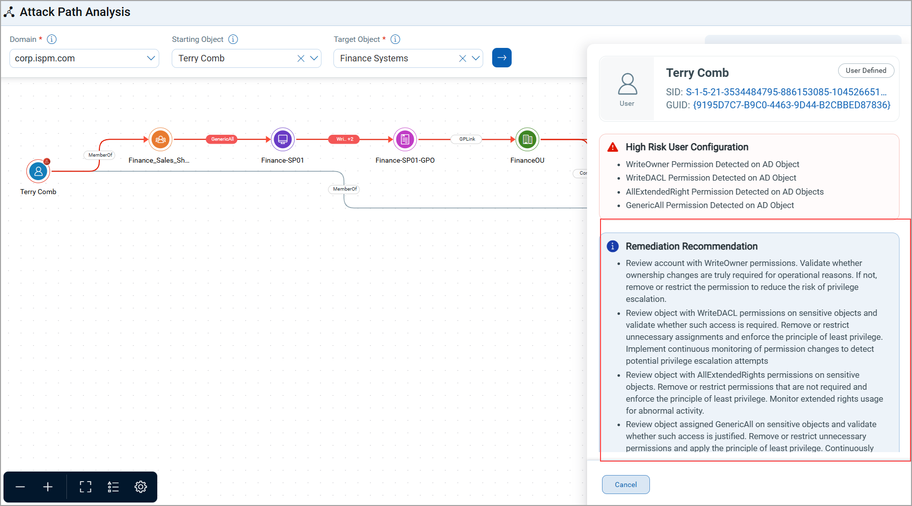 If a suspicious attack path is detected, you can view recommended remediation steps directly from the graph: