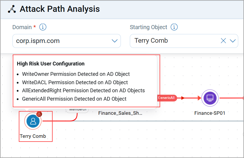 The following scenario demonstrates how a low-privilege user account (Terry Comb) in the domain corp.spm.com can be exploited to gain access to a high-value target (Finance System) due to misconfigurations in access permissions.