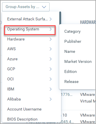 - Group assets are based on criteria or categories, such as external attack surface, operating system, hardware, AWS, and so on. As shown in the following example, some categories have further subcategories: