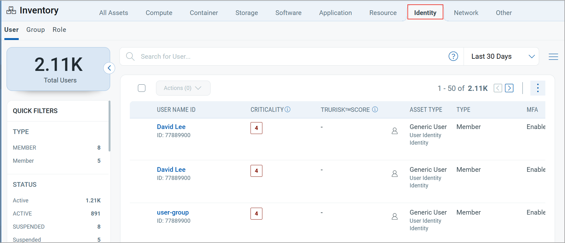 The Identity tab provides all identity-related assets discovered in your environment, such as users, groups, and roles. It helps you understand who has access, how identities are classified, and their associated risk and security posture across the organization.