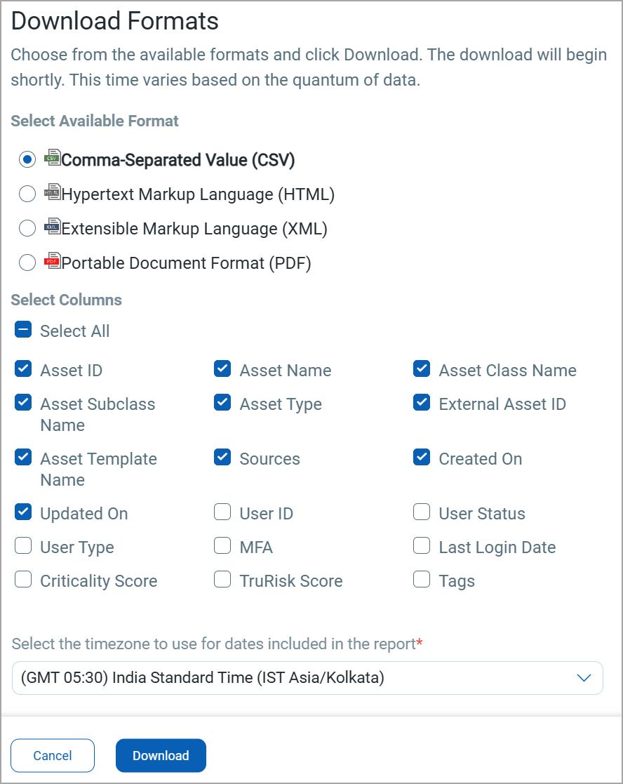 If you want to download the report in PDF format, you can select a maximum of 5 columns. If you select the Tags column, the report for up to 5,000 assets is downloaded.
