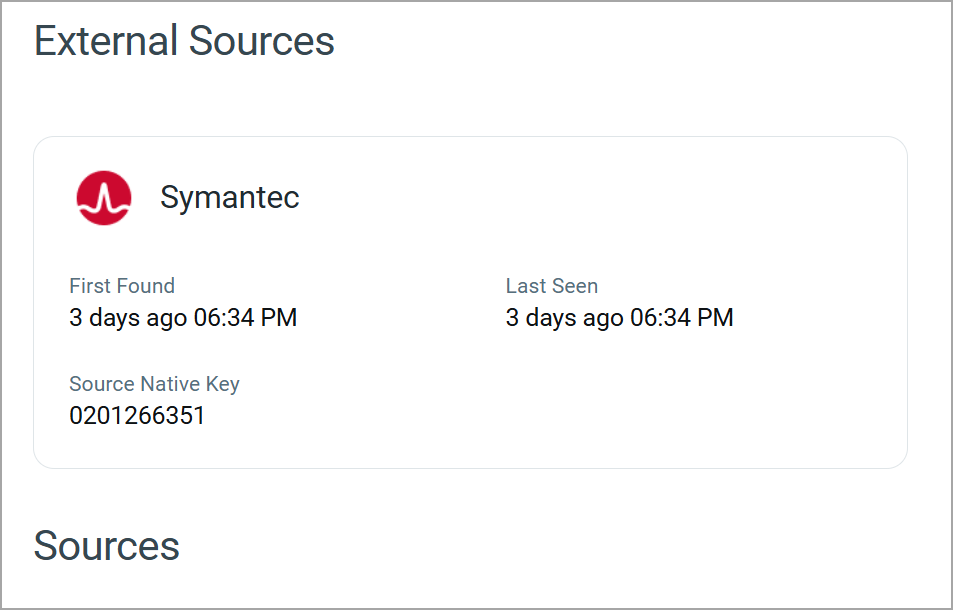 The Sources section lists all discovery sources associated with the user identity. It provides a high-level overview of how the asset is being tracked and updated.