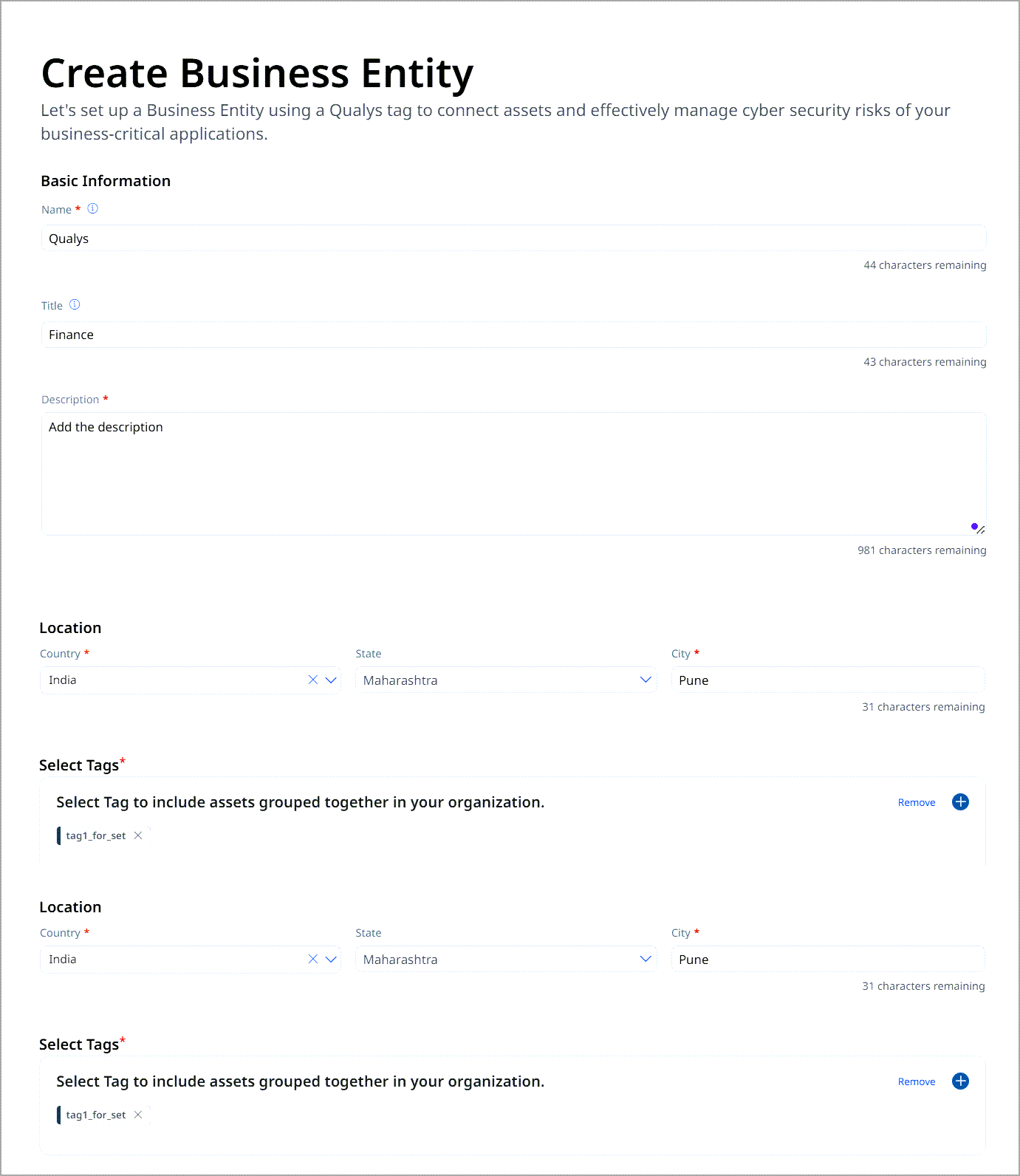 To create a new tag, click Create New Tag.The following screenshot displays the Basic Information, Location, and Select Tags field of the Business Entity onboarding page: