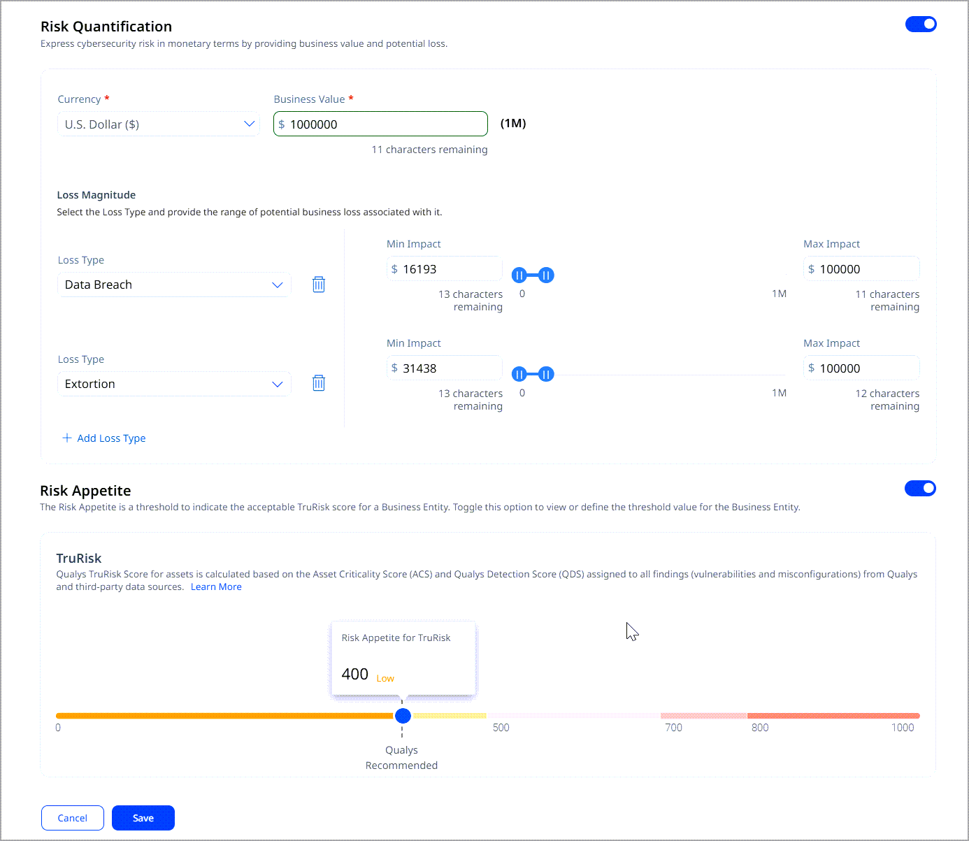 - (Optional) Enable the Risk Appetite toggle to define the TruRisk Score threshold for the Business Entity.
