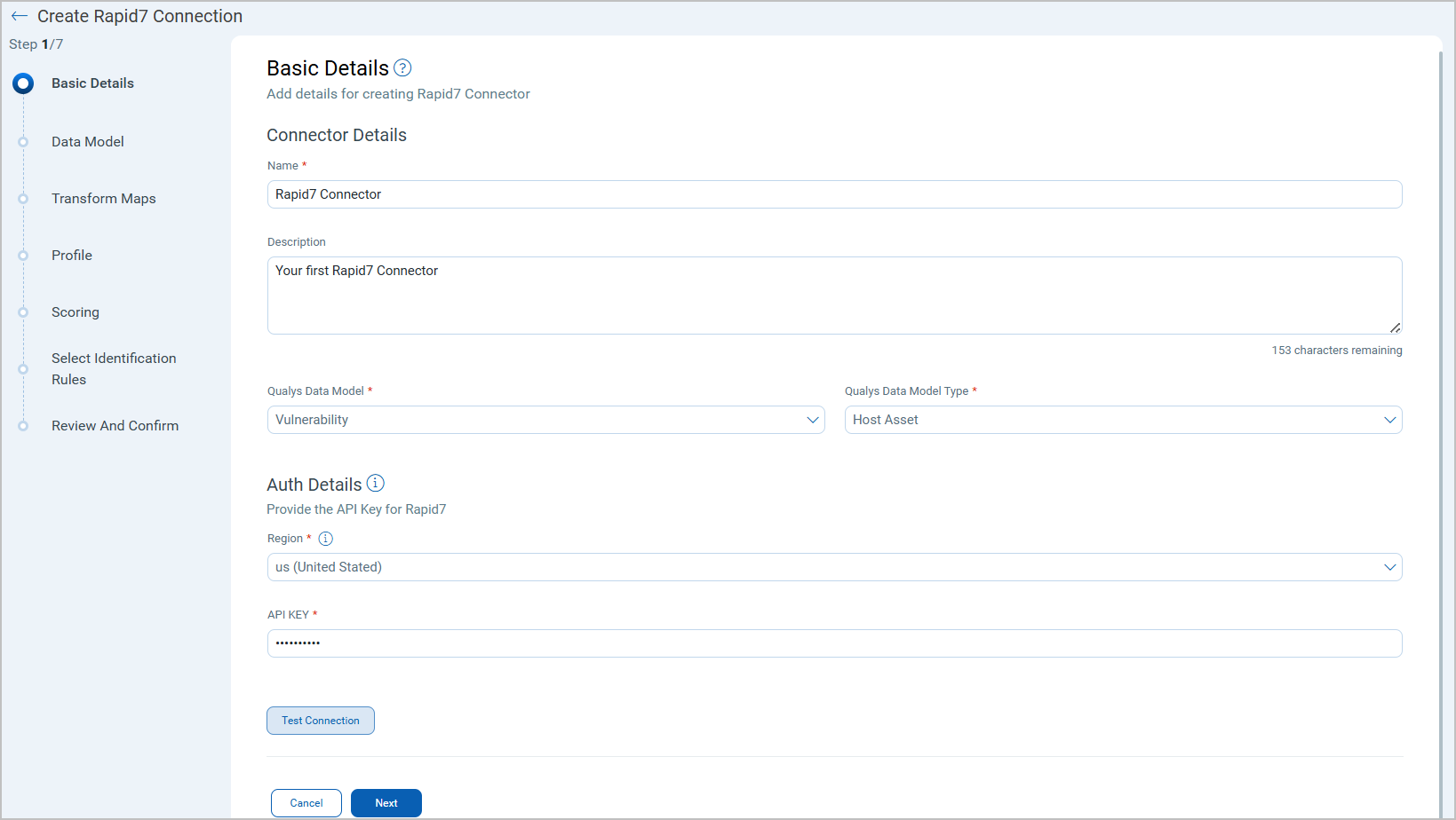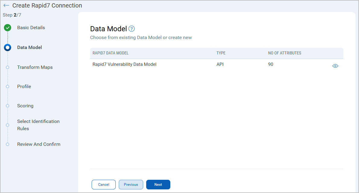 The Rapid7 API Connector offers an out-of-box data model mapping for you to map with Qualys ETM schema. You can view the schema to understand the attributes in the data model.