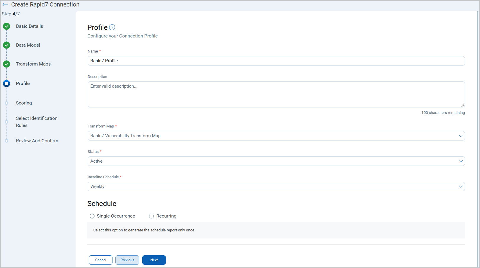 Create a profile with Name, Description, Transform Map, Status, and Schedule.