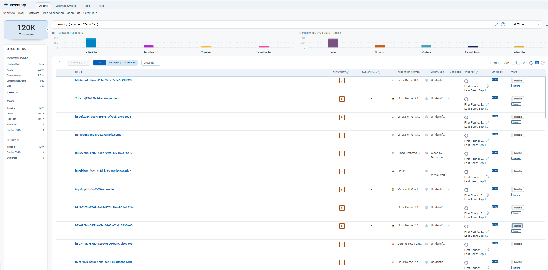 After a successful run, Tenable assets appear in ETM's Inventory:
