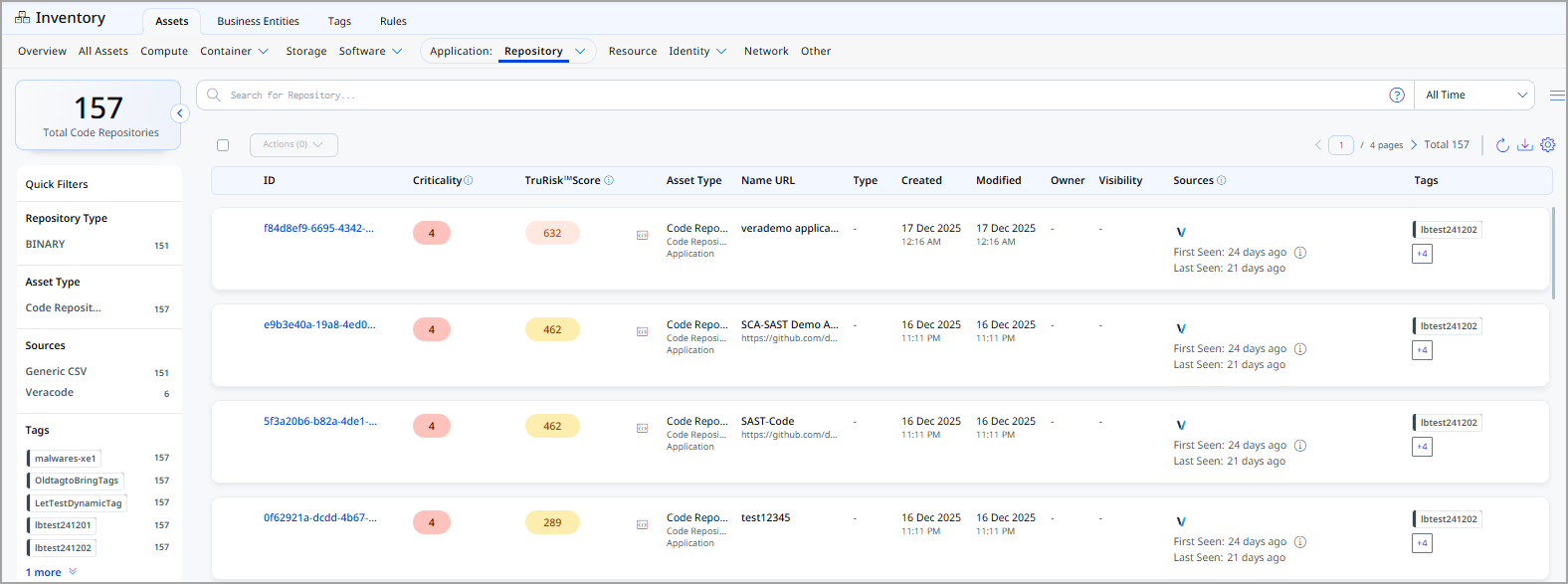 The Repository tab provides all code and binary repositories discovered in your environment. This tab helps you identify, track, and manage repositories that support application development and delivery, such as source code repositories and generic binary repositories.
