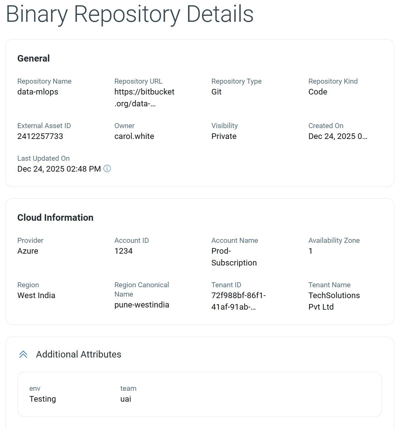 This section displays custom attributes associated with the repository. These attributes are typically used for internal classification and governance.