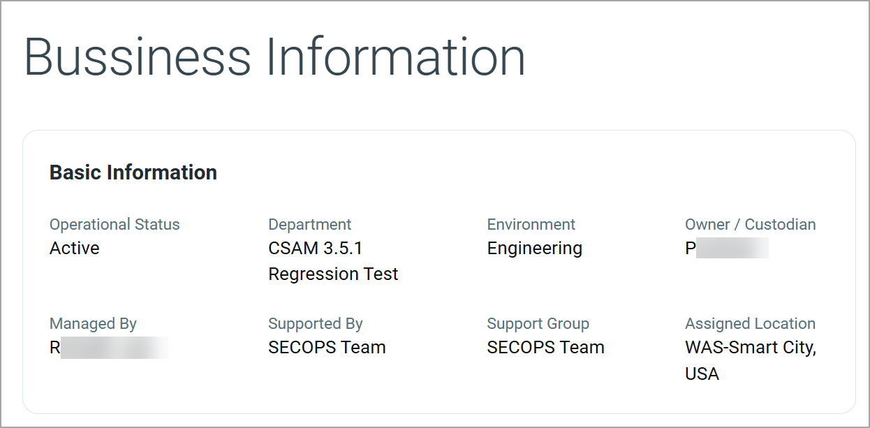 The Business Information tab provides contextual details for the selected repository. This information helps organizations understand the operational purpose of the repository, identify responsible teams, and align the asset with business functions and locations.