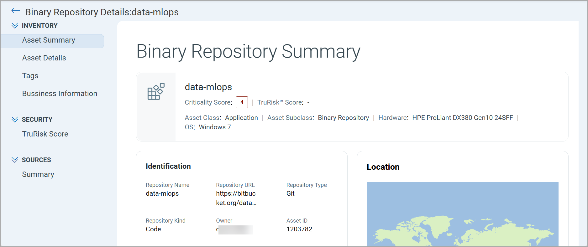 The Inventory section provides access to all inventory-related information for the selected repository asset.