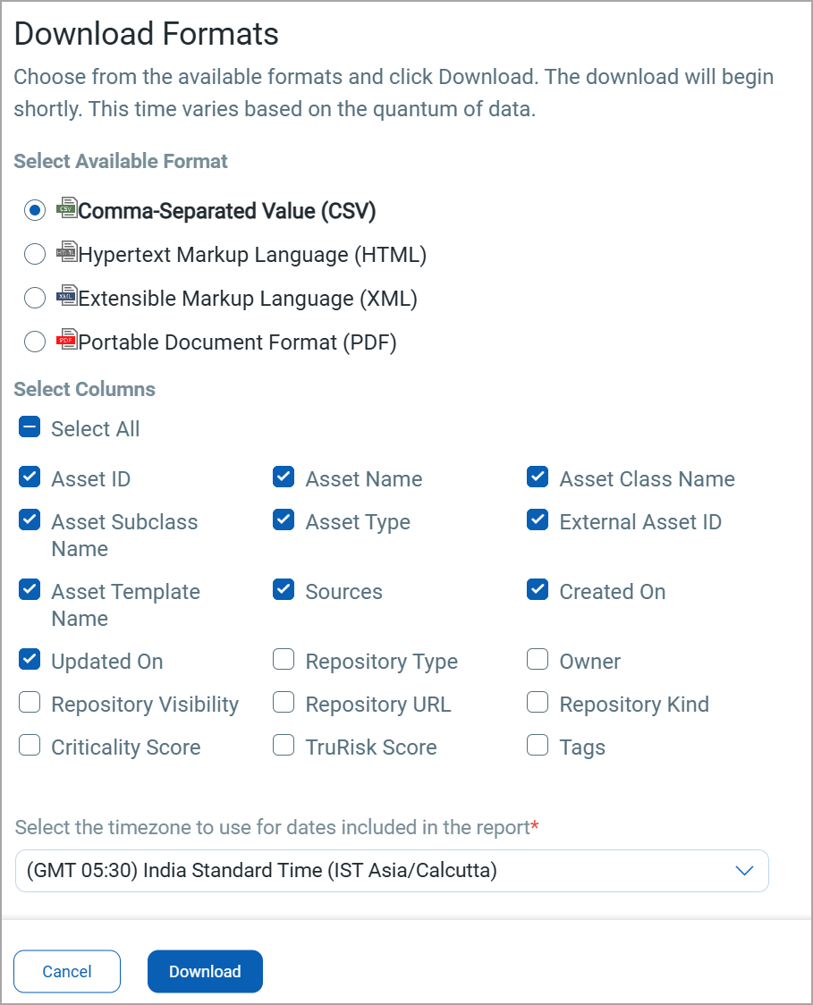 If you want to download the report in PDF format, you can select a maximum of 5 columns. If you select the Tags column, the report for up to 5,000 assets is downloaded.