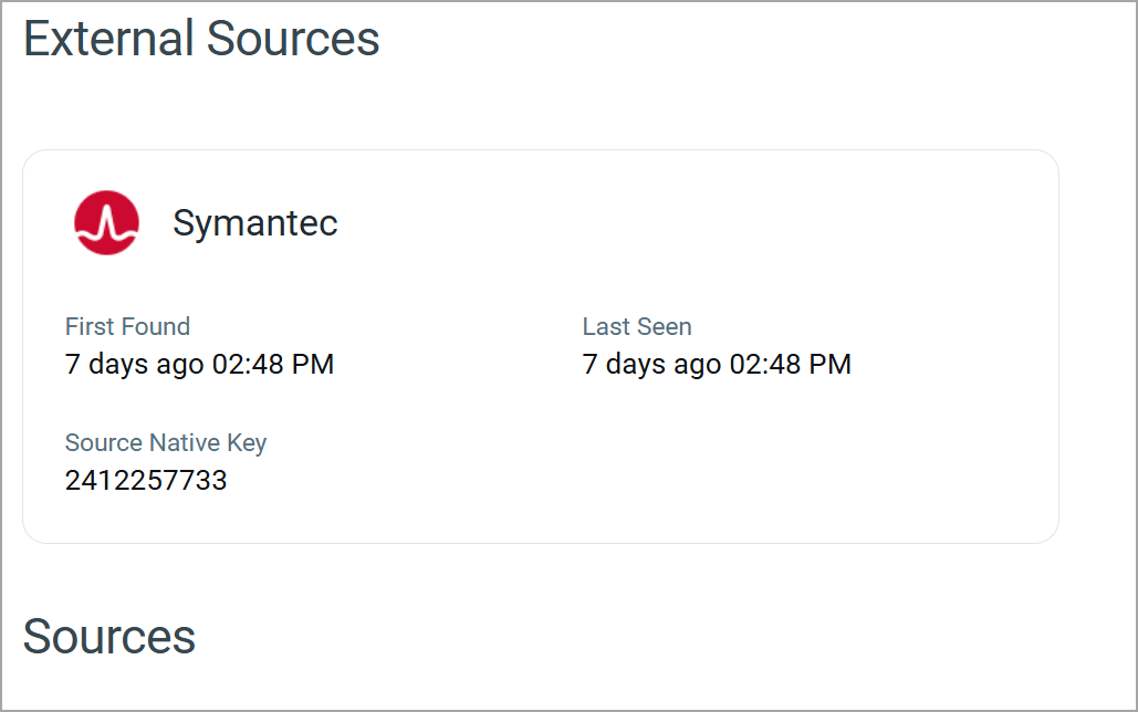 The Sources section lists all discovery sources associated with the repository. It provides a high-level overview of how the asset is being tracked and updated.