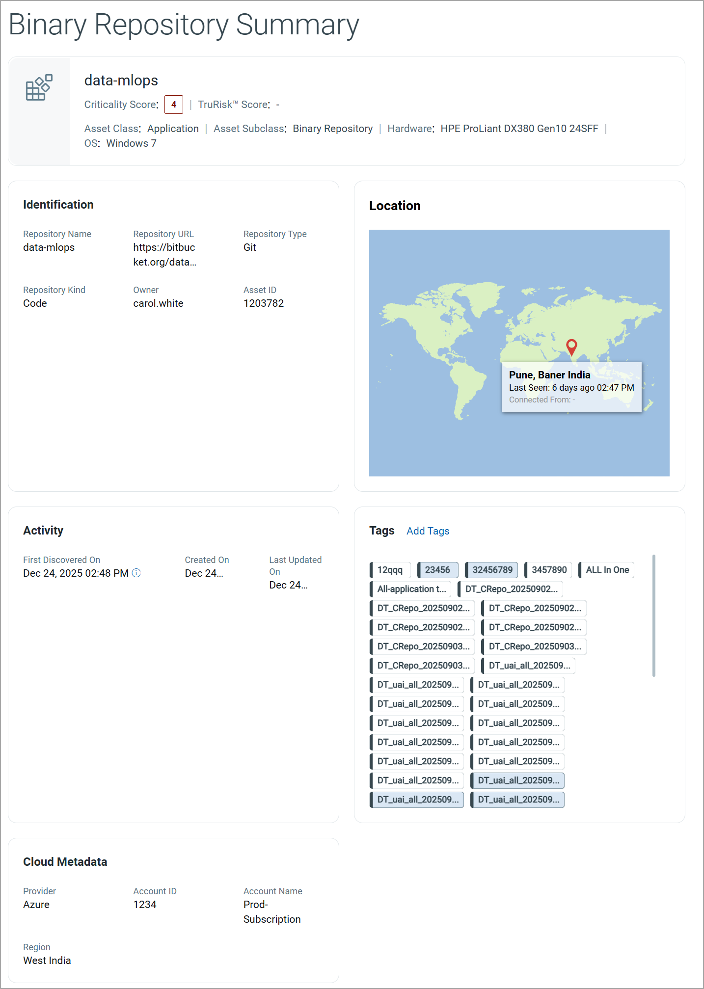The Repository Details page provides a comprehensive view of an individual repository asset and its associated metadata. This page helps you understand the repository’s business importance, ownership, location, security posture, and discovery sources.