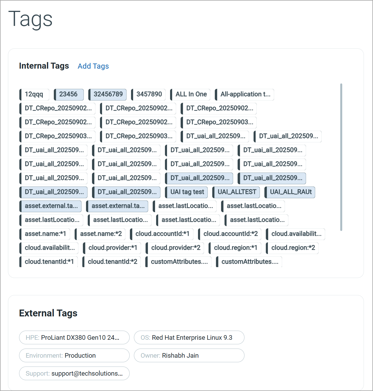 Internal Tags are system-generated or user-defined tags. These tags are commonly used for asset organization, dynamic asset grouping, and policy enforcement.