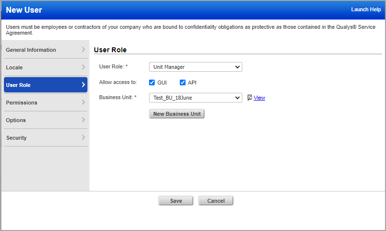 - In the Business Unit field, select the required business unit to be assigned to the user. To see the details of the selected BU, click View.