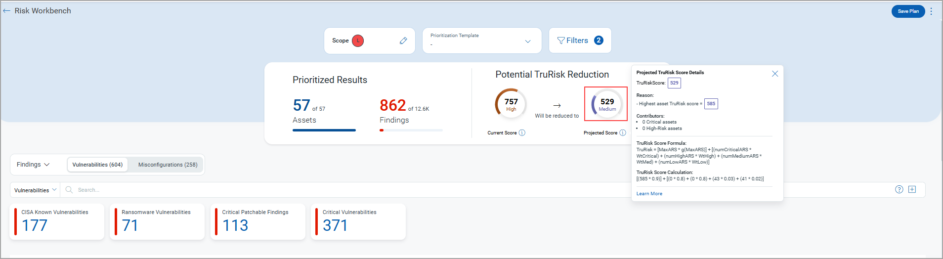 'Your saved plan is being recalculated. The updated TruRisk score will be available soon.'Projected score calculation is done (Approx 2-3Min), you can view the score on the Risk workbench along with the Formula is TruRisk V2 is enabled.