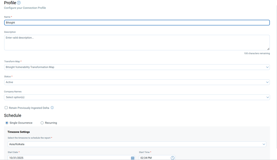 The Company Name filter is a dropdown that displays all the companies configured in your Bitsight instance. Select one or more filters to ensure only the asset, vulnerability, and misconfiguration data of the selected companies are available in the ETM inventory.