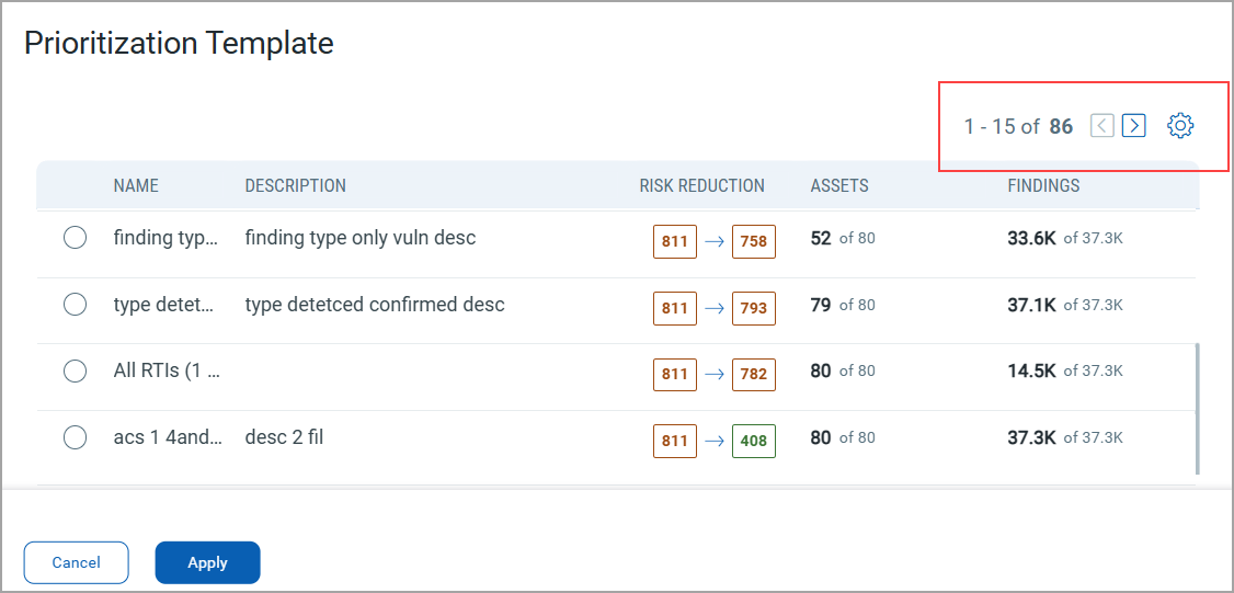 To view these settings, navigate to the Risk Management tab > Risk WorkBench subtabs. Define the scope, and while selecting the prioritization approach, click View All. You can view the pagination support provided for templates.
