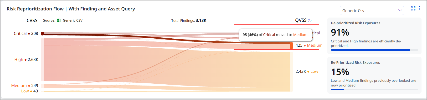 The following image illustrates how the QVSS-based scoring system has downgraded 46% of critical findings to medium priority. This allows your organization to reduce vulnerability noise by highlighting only those findings that can be safely deprioritized. Overall, 91% of findings are effectively downgraded, enabling you to focus your remediation efforts on the issues that truly require attention.