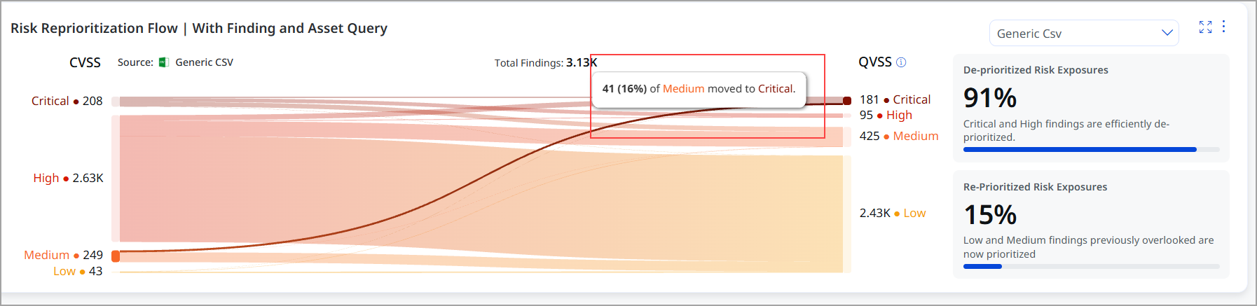 The Risk Reprioritization Flow widget is a new dashboard visualization that helps security teams understand how vulnerability findings move between different risk scoring models. It visually shows how findings are deprioritized or reprioritized when moving from traditional scoring (such as CVSS or source-provided risk scores) to Qualys-driven QVSS.