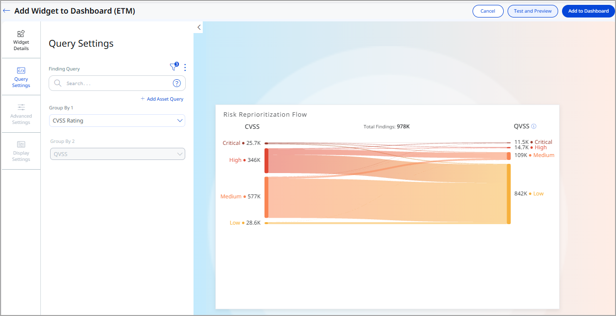 To add the widget to your dashboard, navigate to Dashboard, click Add Widget, and select Risk Reprioritization Flow from available ETM widgets. Enter your queries, customize the widget, and the widget starts showing in your dashboard.