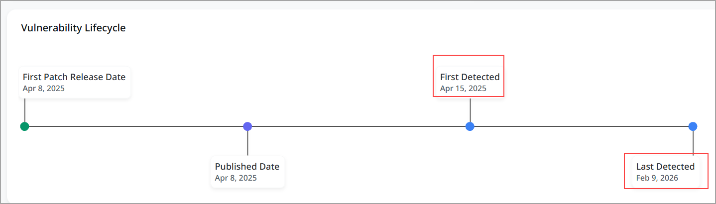 The lifecycle graph now includes: First Detection date, Last Detection date. These dates are now visually reflected within the lifecycle view to provide clearer historical tracking of findings.