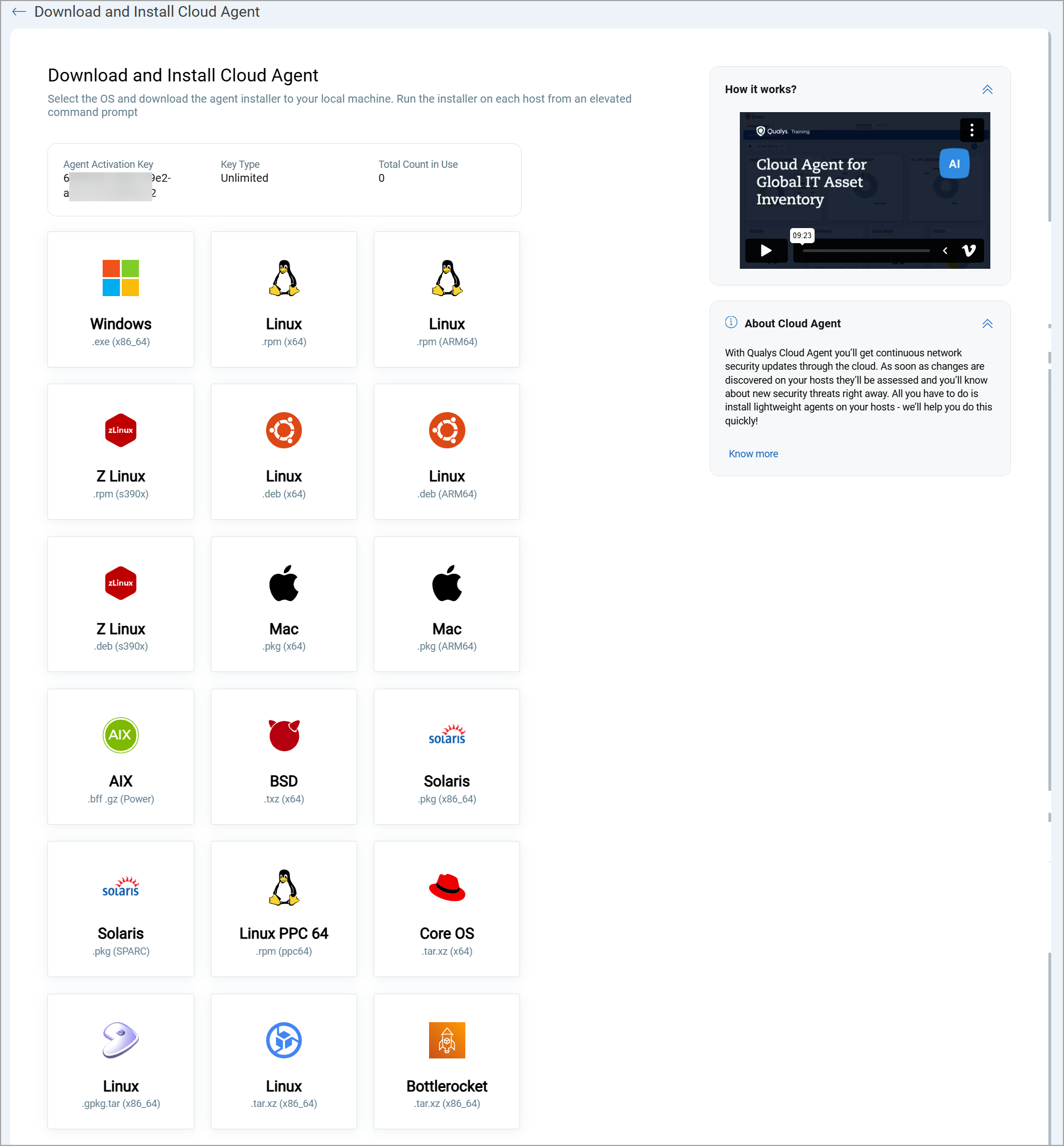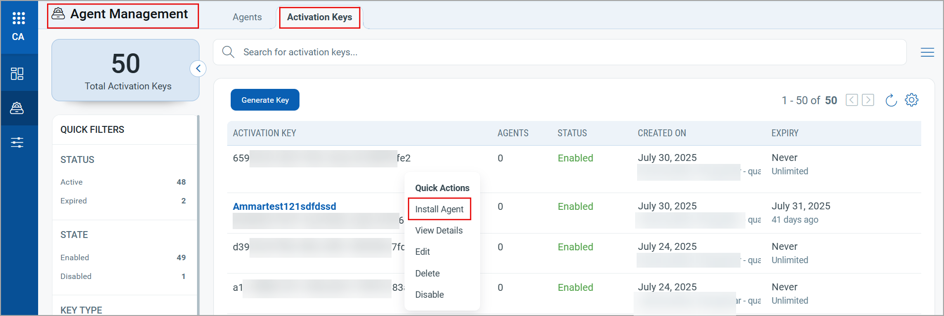 - In the Cloud Agent user interface, navigate to Agent Management > Activation Keys.