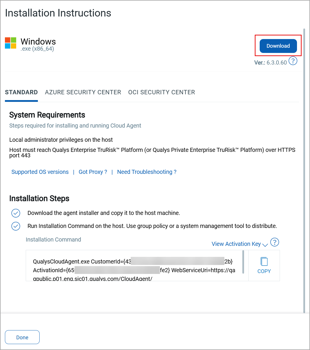 - On the Install Agents page, select an appropriate option from Standard, Azure Security Center, and OCI Security Center as per your requirements.