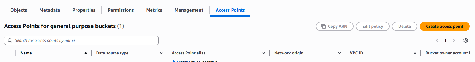{ "Version": "2012-10-17", "Statement": [ { "Sid": "AllowPutViaAccessPointArn", "Effect": "Allow", "Action": "s3:PutObject", "s3:PutObjectTagging" "Resource": "*", "Condition": { "StringEquals": { "s3:DataAccessPointArn": "arn:aws:s3:us-east-2:446278775909:accesspoint/vm-s3-access-point" } } } ] }-