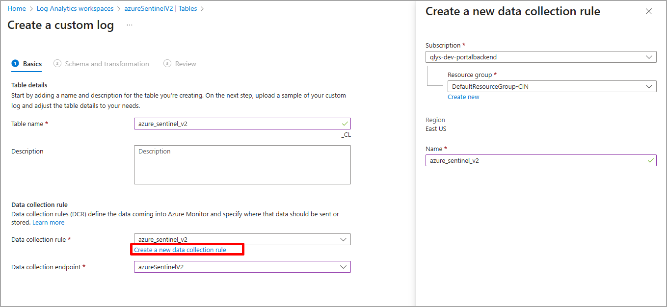 Associate the previously created DCE. - Upload your custom log schema in JSON format.