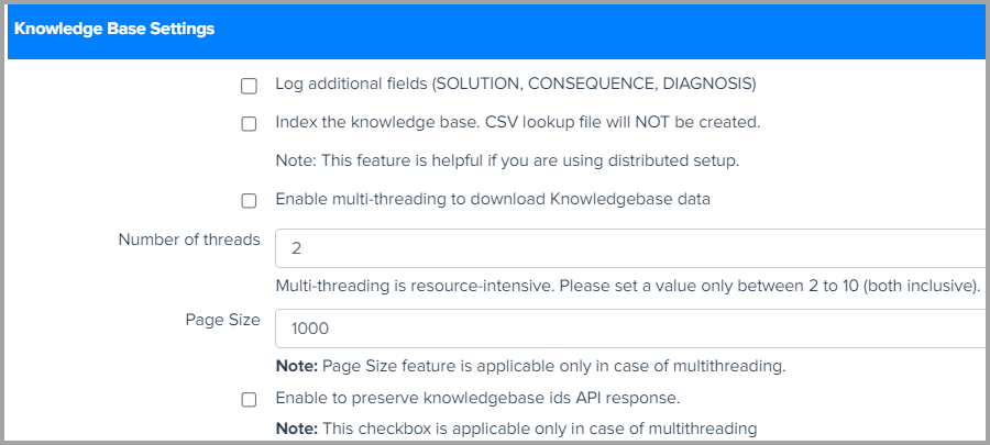 By default, this checkbox is disabled. - Enter Number of threads to pull Knowledgebase data.