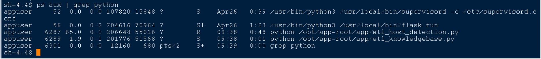 Get the PID (process id) of either etl_host_detection or etl_knowledgebase using the below command inside the container: