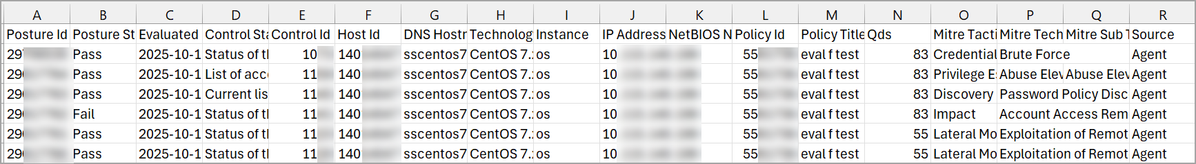 The Posture Control report is downloaded. The report consists of the columns posture ID, status, evaluation date, control statement and ID, host ID, DNS Hostname, technology name, instance, IP address, NetBIOS name, policy ID, policy title, QDS, Mitre Tactic Name, Mitre Technique Name, Mitre Sub Technique Name, and source.