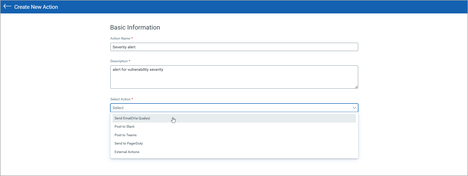 - From Select Action, select an action to specify the mode of sending alert messages via any of the following actions: