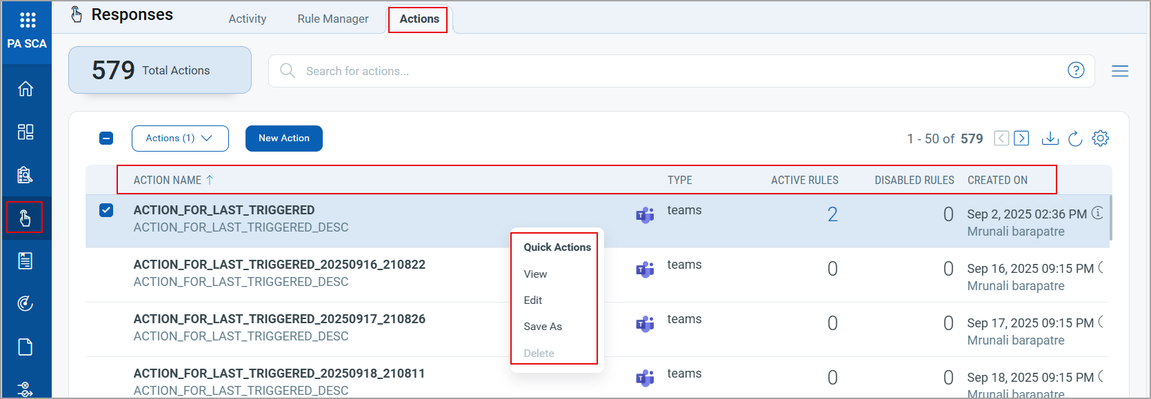 The Actions tab lists the Action Name, the Type of the action, the number of active or inactive rules, and the Created On date and time of the rule. The list of actions is based on the Action Setting selected while creating a new rule from the Rule Manager.