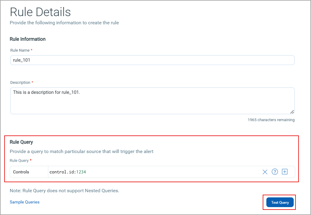 - In the Rule Query section, specify a query for the rule. The system uses this query to search for events. Use the Test Query button to test your query. If the Qualys Query Language (QQL) is not supported, you will be notified via the error message. The following screenshot is an example of the Rule Details section: