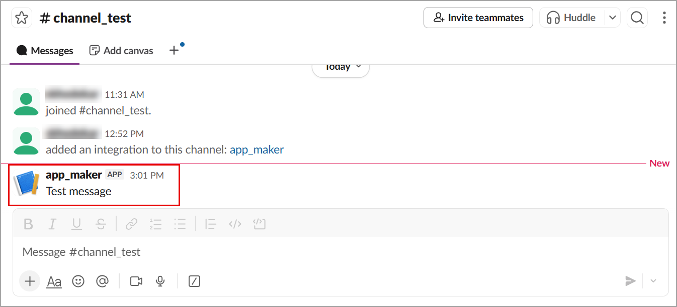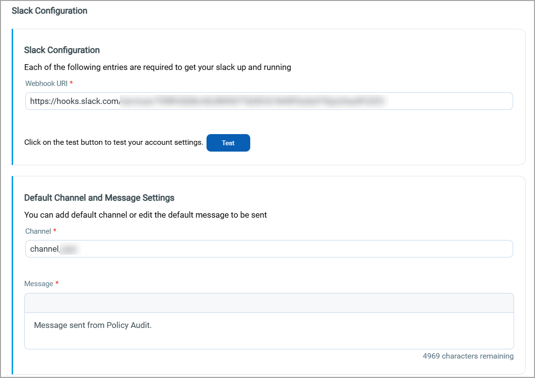 Note: Select Test to send a test message to the channel associated to the webhook URL in Slack.