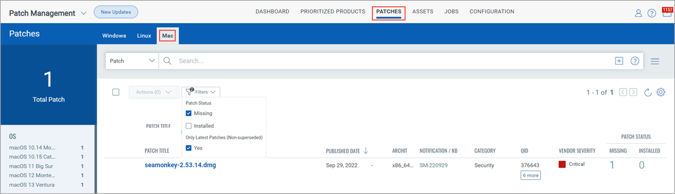 Alternatively, you can go to the Assets tab to view missing patches count on particular assets. Once a deployment job on a Mac asset is executed, the missing and installed patches on the assets will be updated when the subsequent patch scan is completed.